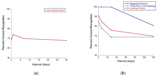 Another form of long-term olfactory memory is odor recognition memory, e.g., [10,11,12,13]. This is memory for odors, per se. In tests of odor recognition memory [14,15], people are presented with one odor or a set of several odors and asked to recognize the odor or odors sometime later. Using such tasks, classic papers in the literature have reported forgetting curves for odors that are relatively “flat” [16,17,18,19]. For example, the results of Engen and Ross [16], as shown in Figure 1a, and those of Lawless [17], as shown in Figure 1b, demonstrate relatively little forgetting of odors over time. In the latter case, the flat forgetting curves follow an initial rapid decline for odors and free form pictures and a significant decline for pictures at longer delays. This has been taken as evidence for the longevity of odor memory.