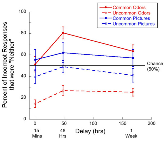 Second, we ask whether “neither” responses make up more than half of all incorrect responses. Such responses indicate that participants perceived both the target odor and the foil as novel. Figure 3 shows the percent of incorrect responses that were “neither” as a function of delay for the four stimulus types.