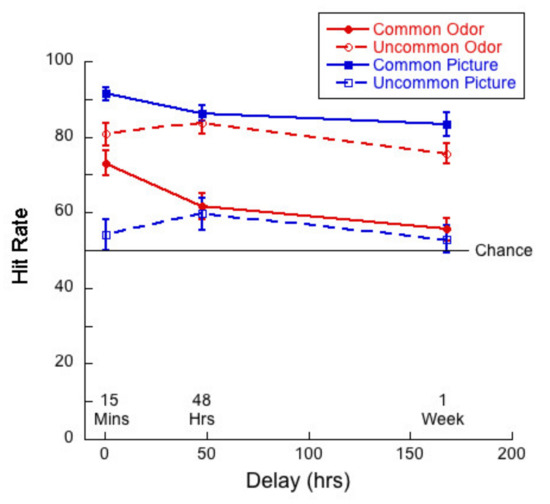 We analyzed the effect of delay on hit rates and correct rejections to explore the extent to which people had some sort of trace or template memory (hit) and the extent to which they are relying on novelty detection (correct rejection). Figure 5 shows hit rate as a function of delay for common and uncommon pictures and odors.