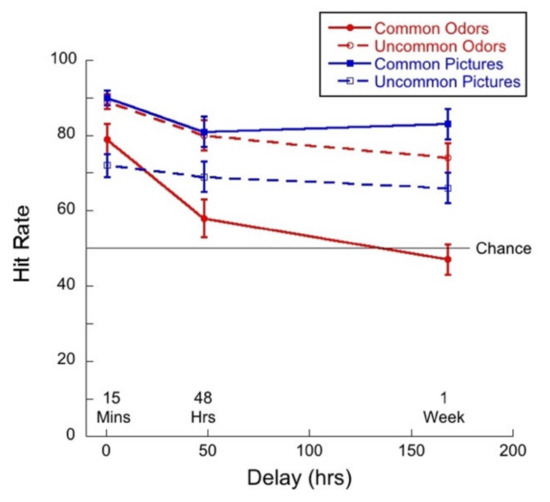 Notwithstanding the flat forgetting curves, classic data in the odor memory literature do not support the notion that odor memory is better than visual memory in an absolute sense. For example, the data from Lawless [17] (see Figure 1b) demonstrated that the recognition of magazine pictures at short delays was perfect, while odors were recognized at a significantly lower rate, which was more similar to that of “free form” (FF) images. Likewise, more recently Cornell Kärnekull and colleagues [10] showed that memory for faces is better (higher d’ and hit rates) than memory for odors. Moreover, Cornell Kärnekull and colleagues [10] also reported forgetting curves for images and odors that were very similar (i.e., memory for both types of stimuli deteriorated similarly over time) consistent with Murphy and colleagues [20] and Olsson and colleagues [21], calling into question the widely held believe that memory for odors is long-lasting and immune to forgetting.