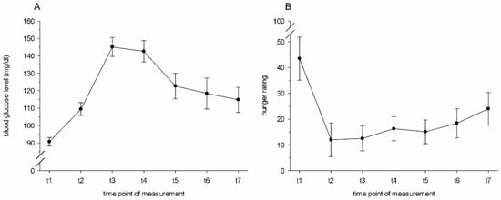 At a total of 7 timepoints, the donors’ hunger level was assessed, and a capillary blood sample was taken from the fingertips of the non-dominant hand using disposable lancets (ACCU-CHEK® Safe-T-Pro Plus, Roche Diagnostics, Mannheim, Germany). A glucometer device from Roche (ACCU-CHEK® Aviva, Roche Diagnostics, Mannheim, Germany) and the corresponding disposable test strips (also ACCU-CHEK® Aviva) served to measure capillary blood glucose levels at 5 min prior to the beginning of the breakfast (t1), and then again at 15 (t2), 30 (t3), 45 (t4), 68 (t5), 86 (t6), and 105 (t7) minutes after the donors had started their breakfasts. The hunger level was rated via a visual analogue scale, ranging from 0 (“not hungry at all”) to 100 (“extremely hungry”). At each timepoint after the standardized breakfast (t2–t7), the donors had a higher blood glucose level compared to prior to the standardized breakfast (t1, all ps ≤ 0.006, 1-sided; Figure 1A). Accordingly, the donors reported being hungrier before the breakfast (t1) compared to each timepoint after the breakfast (t2–t7, all ps ≤ 0.031, 1-sided, Figure 1B).