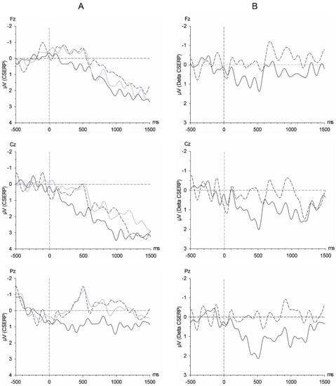 (A) Grand average of the chemosensory event-related potentials (CSERPs) in response to satiety sweat (solid black line), fasting sweat (dashed black line), and cotton (solid grey line). (B) Grand average of the difference chemosensory event-related potentials (Delta CSERPs) in response to satiety sweat in reference to cotton (solid line), and fasting sweat in reference to cotton (dashed line). Timepoint 0 refers to the activation of the switching valves.