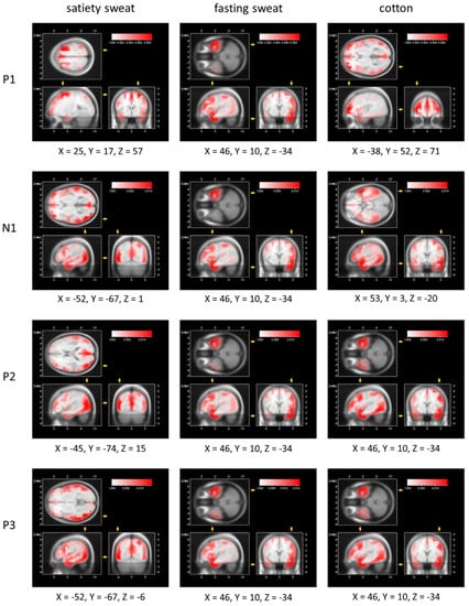 Low-resolution electromagnetic tomography analysis (LORETA) maps depicting the location of the maximum current density (in μA/mm2) upon the presentation of satiety sweat, fasting sweat, and cotton at the time of the individual mean P1 (satiety sweat = 358 ms, fasting sweat = 328 ms, cotton = 352 ms), N1 (satiety sweat = 480 ms, fasting sweat = 444 ms, cotton = 460 ms), P2 (satiety sweat = 654 ms, fasting sweat = 654 ms, cotton = 684 ms), and P3 latencies (satiety sweat = 892 ms, fasting sweat = 874 ms, cotton = 896 ms).