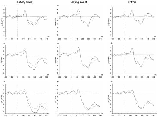 Grand average of the visual event-related potentials (VERPs) in response to overweight (black line) and underweight avatars (grey line) in the context of satiety sweat (left column), fasting sweat (middle column), and cotton (right column) at Fz (upper row), Cz (middle row), and Pz (lower row). Timepoint 0 refers to the onset of the avatars’ presentation.