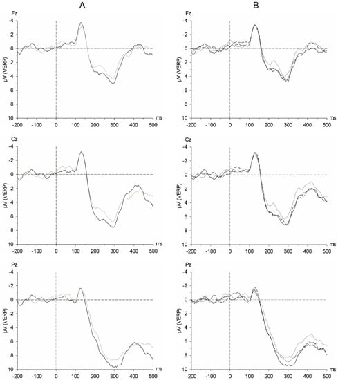 (A) Grand average of the visual event-related potentials (VERPs) in response to overweight (black line) and underweight avatars (grey line) across all chemosensory context stimuli. (B) Grand average of the visual event-related potentials (VERPs) in response to all avatar shapes in the context of satiety sweat (solid black line), fasting sweat (dashed black line), and cotton (solid grey line). Timepoint 0 refers to the onset of the avatars’ presentation.