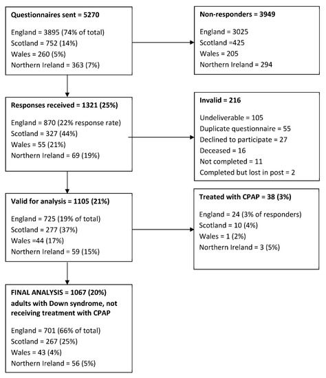 Summary of questionnaires distributed to adults with Down syndrome residing within the UK, returned to the investigators and included in the final analysis.