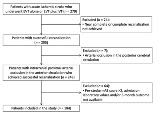 A total of 255 out of 279 ischemic stroke patients undergoing treatment with EVT alone or EVT plus IVT achieved successful recanalization of occluded vessels, defined as near-complete or complete recanalization. Seven patients were excluded due to occlusion of posterior brain circulation, and 64 patients were excluded due to pre-stroke mRS >2 or unavailability of admission laboratory values and/or 3-month outcome. Accordingly, 184 patients were included in the analysis (Figure 1).