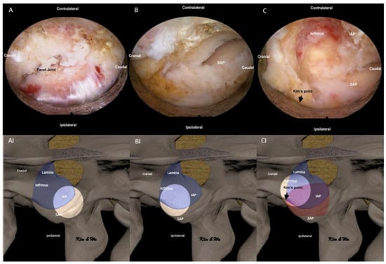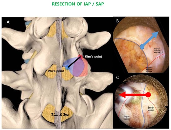 Inferior articular process is a process of a cephalad vertebra of the spinal segment that lies on each side of the neural arch and projects downward and processes vertical convex articular facets which face anterolaterally articulating with the superior articular process of the next caudal vertebra. It is convex dorsally and laterally (Figure 1A) [21]. In the magnified field under endoscope, the superomedial aspect of the inferior articular facet is often medial and deep to the mid-point of the bony arch forms from the ipsilateral spinolaminar junction of the cephalad lamina to the most inferomedial rounded edge of the inferior articular process, which we labelled as Wu’s point in this paper for illustration purposes (Figure 1A,B). This point is at the sloping edge of the medial laminofacet junction medial to which the inferior articular process slopes ventrally caudally and laterally to join the medial superior edge of the superior articular process. The rotatores spinae muscles are associated medial to the edge. Profuse bleeding can occur leading to poor visualization of the endoscopic view when soft tissue dissection occurs medial to the edge of Wu’s point. From Wu’s point, the endoscope moves obliquely upwards and laterally on the dorsal convexity of the inferior articular process to the superolateral edge of the inferior articular facet which articulates the superolateral edge of the superior articular facet, which we have labelled as Kim’s point for illustration purposes. Kim’s point is therefore the confluence of the superolateral edge of the superior articular process and the superolateral edge of inferior articular process (Figure 1A,C). The Kim’s point is often covered with facet capsule. Exposure of Kim’s point as an endoscopic anatomical landmark involves using a flexible curve radiofrequency ablator to dissect the facet capsule on the lateral edge of the facet joint, followed by endoscopic drilling at the lower and lateral edges of the inferior articular facet to expose the underlying lateral edge of the superior articular facet. Once the superior articular facet was found, we continued endoscopic drilling in the cranial direction along the exposed facet joint to the superolateral edge of the facet joint, which would be Kim’s point. The multifidus muscle drapes this bony region, lateral to Kim’s point is the intertransverse membrane and ventral to the intertransverse membrane is associated with radicular artery and exiting nerve root (care is taken during endoscopic soft tissue dissection lateral to Kim’s point, so as not to breach the intertransverse membrane and cause unnecessary bleeding of the radicular artery).