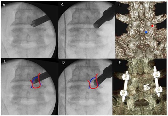 (A) The endoscope is docked and moved to Wu’s point. (B) Wu’s point is close to the fluoroscopic image of the medial confluence of medial edge of outline of inferior articular process (red line) and superior articular process (blue line). (C) The endoscope is docked and moved to Kim’s point. (D) Kim’s point is close to the fluoroscopic image of the lateral confluence of lateral edge of outline of inferior articular process (red line) and superior articular process (blue line). (E) Preoperative 3D reconstructed CT scan assisted the planning of docking region, on Wu’s point (blue circle) and Kim’s point (red circle). (F) Postoperative 3D reconstructed CT showed the final position of the cage and pedicle screws.