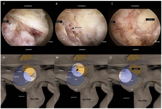 We used normal saline with an irrigation pressure of 25–40 mm Hg with an irrigation pump during most parts of the endoscopic fusion procedure. We first performed soft tissue dissection around the medial aspect of the facet joint, the medial edge of laminar and isthmus with radiofrequency ablator. We looked for the endoscopic landmark of the spinolaminar junction and medial rounded edge of the facet joint (Figure 3A,AI). We dissected the soft tissue and identified the midpoint of the bony arch formed from the spinolaminar junction and the most inferomedial aspect of the inferior articular facet labelled as Wu’s point (Figure 3B,BI). Endoscopic drilling was started at Wu’s point for ETLIF (I). In ETLIF (I), resection of IAP was done starting from Wu’s point drilling of IAP in an oblique inside-out, medial to lateral and caudal to cephalad direction towards Kim’s point. During endoscopic drilling, the initial outer cortical bone zone of isthmus had minimal bleeding, which was followed by a bleeding cancellous bone zone which often required radiofrequency ablation for hemostasis and finally the inner cortical bone of isthmus which had dense bone with minimal bleeding. The inner cortical layer was drilled till a thin layer was left. Using the working retractor tube, we put direct pressure on the IAP which would perform a control fracture of the thin residual layer of IAP from the endoscopic drilling track. IAP was harvested as an autograft.