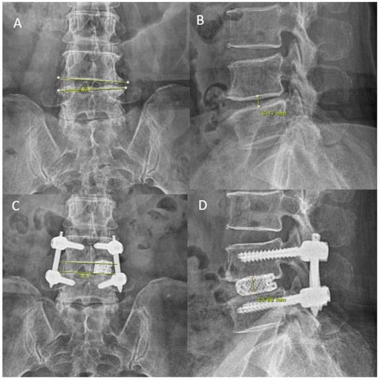 Roentgenogram measurement pre- and post-operative for disc height and coronal wedging in a 57 year old female who presented with pain score VAS 7 on the back with movement with bilateral lower limbs claudication. (A) Her preoperative anteroposterior roentgenogram measured a coronal wedge angle of 6.3°. (B) Her preoperative lateral roentgenogram measured a mid-disc height of 8.47 mm. (C,D) uniportal endoscopic posterolateral lumbar interbody fusion Outside-in Approach, ETLIF (O) performed, on postoperative day 1 roentgenogram, coronal wedge angle measured 0.5° anteroposterior roentgenogram and lateral roentgenogram measured mid-disc height of 13.88 mm.