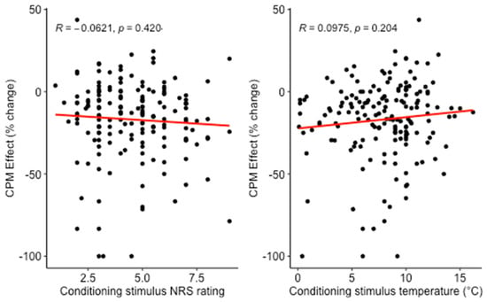 In addition, many different experimental paradigms have been used [] which may also influence CPM magnitude., e.g., the role of conditioning stimulus intensity has been investigated repeatedly with inconsistent results. While some studies find no effect [,,], others find larger CPM with stronger conditioning stimuli [,,]. It has been proposed that as long as it is clearly painful, further increases in conditioning stimulus intensity do not increase CPM magnitude [,]. It might also occur that conditioning stimulus intensity does have an effect in within-subject designs [,], but that the effect is small compared to inter-individual differences, which makes it difficult to detect in cross-sectional designs. In addition, it is worth considering whether physical stimulus intensity or rather subjective pain perception of the conditioning stimulus is related to CPM magnitude.