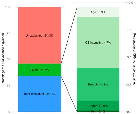 - Inter-individual differences explained a large proportion of CPM variance (24.0% to 34.2%) while all fixed effects together (CS pain or physical intensity, age, sex, CPM paradigm, measurement repeat) predicted only 3.4% to 11.5% of CPM variance.