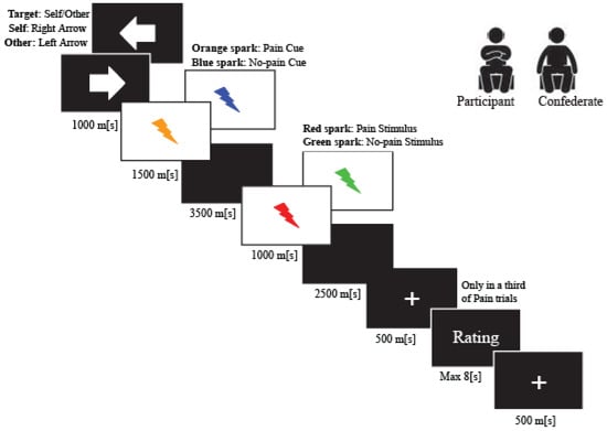 Initially, we presented an arrow (1500 ms) indicating the target of the upcoming electric stimulus (arrow to the right: stimuli delivered to the participant; arrow to the left: stimuli delivered to the confederate). We then presented an anticipatory cue (500 ms) indicating the intensity of the upcoming electric stimulus (orange sparkle for pain stimulus and blue sparkle for no-pain stimulation). After the anticipatory cue, we delivered the electrical impulse at the onset of the second visual stimulus (red spark for pain stimulus and green sparkle for non-pain stimulation), lasting 1000 ms.