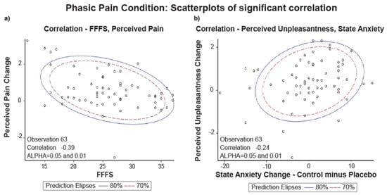 The scatterplots of Figure 3 show that the two variables’ data distribution is within the two ellipses (70% and 80% of the data). The displayed prediction ellipses in the figures are centered at the two variables’ means (alpha = 0.05 and 0.01). Thus, we can say that the variable FFFS scores with a perceived pain change and state anxiety with perceived unpleasantness change are normally distributed and correlated.