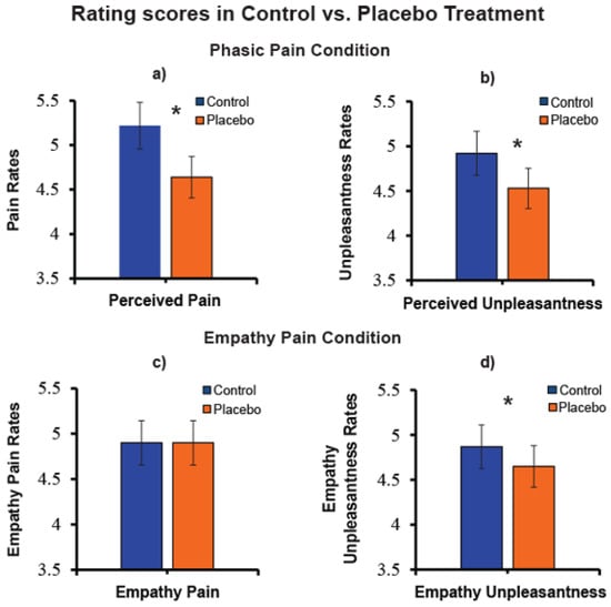 (a) Pain rating mean values of perceived pain in control and placebo treatment (N = 63); (b) Unpleasantness values of perceived unpleasantness mean values in control and placebo treatment (N = 63); (c) Empathy for pain mean ratings in control and placebo treatment (N = 63); (d) Empathy for unpleasantness mean ratings in control and placebo treatment.“*” Significant planned comparisons, p < 0.05.