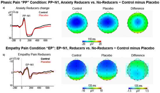 (a) ERP, Scalp maps and difference (control minus placebo) maps of PP−N1 amplitude for control and placebo treatments in high state anxiety reducers (N = 26); (b) ERP, Scalp maps, and difference maps of EP−N1 amplitude in other pain reducers (N = 31) during the empathy pain condition.