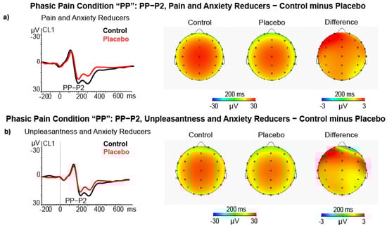 (a) ERP, Scalp maps and difference maps of PP−P2 amplitude in high pain and state anxiety reducers (N = 15); (b) ERP, Scalp maps and difference maps of PP−P2 amplitude in high pain and state unpleasantness reducers (N = 15).