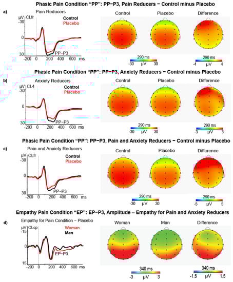 (a) ERP, Scalp maps and difference (control minus placebo) maps of PP−P3 amplitude in high pain reducers (N = 32); (b) ERP, Scalp maps, and difference maps of PP−P3 amplitude for control and placebo treatments in high state anxiety reducers (N = 26); (c) ERP, Scalp maps and difference maps of PP−P3 amplitude in high pain and state anxiety reducers (N = 15); (d) ERP, Scalp maps and difference maps of EP−P3 amplitude in women (N = 32) vs. men (N = 31) during the empathy pain condition.
