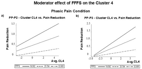 Moderator effect of FFFS on the Cluster 4 (CL4) for the Phasic Pain condition: difference vs. Pain reduction for (a) PP-P2 amplitude; (b) PP-P3 amplitude difference scores.