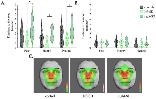 Average number of fixations to the eyes and mouth are presented in Figure 3. For fixations to the eyes, analyses revealed a significant main effect of group (F(2,34) = 4.725, p = 0.015, ηp2 = 0.217). Overall, right-SD had significantly greater fixations to the eyes than left-SD (p = 0.013) and marginally more fixations to the eyes than controls (p = 0.079). Differences between left-SD and right-SD were observed in all three emotion conditions (fear, p = 0.017; happy, p = 0.010; neutral p = 0.023). While the mean number of fixations was lower in left-SD than controls, this difference was not statistically significant averaged across emotions (p = 0.436), or for any individual emotional condition (all p values > 0.7).