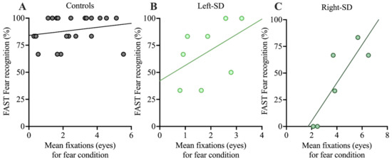 Correlations between performance on the FAST for fear recognition and mean number of fixations to the eyes in the fearful condition in A: controls, B: left-SD, and C: right-SD. FAST: Facial Affect Selection Task.