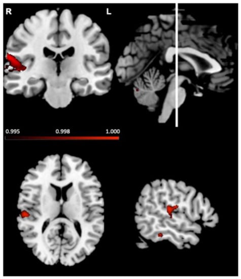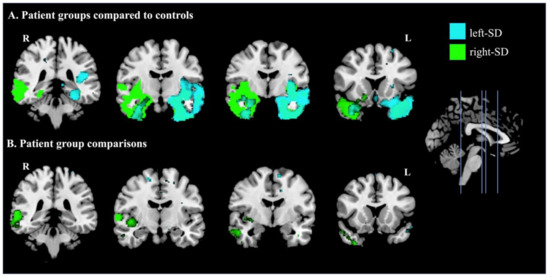 Whole-brain structural Magnetic Resonance Imaging (MRI) scans were obtained using a 3-Tesla scanner. High resolution T1-images were acquired using the following sequences: coronal orientation, matrix 256 × 256, 200 slices, 1 × 1 mm in-plane resolution, slice thickness 1 mm, echo time/repetition time = 2.6/5.8 ms, flip angle α = 8°. MRI scans were required to: (i) be of sufficient quality for neuroimaging analysis, (ii) acquired on the same scanner, and (iii) for SD patients to be acquired within 6 months of the behavioural task. Thirty-two scans (20 controls, 7 left-SD, 5 right-SD) were available for VBM analysis using FSL (FMRIB Software Library, Oxford, UK, https://fsl.fmrib.ox.ac.uk, accessed on 9 September 2021). One scan was acquired on a different MRI scanner, two individuals did not undergo scanning due to MRI contraindications, two were excluded due to poor quality, and one control was excluded due to an incidental finding on MRI. Structural images were brain-extracted using BET, then tissue segmentation was conducted with automatic segmentation (FAST) [52]. Grey matter partial volume maps were aligned to Montreal Neurological Institute (MNI) standard space (MNI152) using non-linear registration (FNIRT) [53] which uses a b-spline representation of the registration warp field [54].