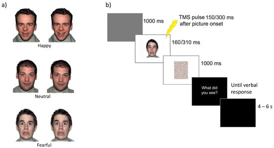 - Schutter, D.J.L.G.; Hofman, D.; Van Honk, J. Fearful faces selectively increase corticospinal motor tract excitability: A transcranial magnetic stimulation study. Psychophysiology 2008, 45, 345–348. [Google Scholar] [CrossRef] [PubMed]