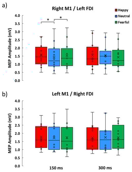 Boxplots showing MEP amplitudes recorded during the presentation of happy, neutral and fearful facial expressions at 150 and 300 ms from the stimulus onset. (a) Data from the right M1 experiment showing an early increase of MEPs for emotional facial expressions. (b) Data from the left M1 showing no MEP modulation. Asterisks denote significant Wilcoxon comparisons (p < 0.05).