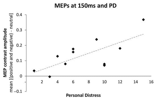 Lastly, we found that the magnitude of early motor facilitation to emotional faces was predicted by the IRI’s PD scores. The PD scale assesses aversive, self-focused emotional reactions of personal anxiety and distress when seeing the misfortunes of others []. While personal distress may counteract mature forms of empathy [,,], imaging studies have reported that participants who score high on the PD scale show enhanced reactivity of the insula when seeing both happy and disgusted facial expressions [], as well as painful expressions [], suggesting that high personal distress levels are associated with a general increase in emotional reactivity to others’ emotions. These findings are in line with electrocortical and imaging evidence showing that stronger visual cortex sensitivity to social and emotional information is linked with interpersonal anxiety-related dispositions [,,]. Such a link between inter-individual differences in PD scores and the magnitude of the motor cortex reactivity was also observed in other experimental conditions, i.e., with complex negative scenes and emotional body postures [,], as well as during the observation of the pain of others [], in keeping with the notion that anxiety-related traits are associated with greater motor excitability [] and weaker motor control when facing emotional stimuli []. Taken together, these findings provide further support to the view that anxiety-related traits influence the way in which social and emotional signals are processed in the brain [,,,,,,].