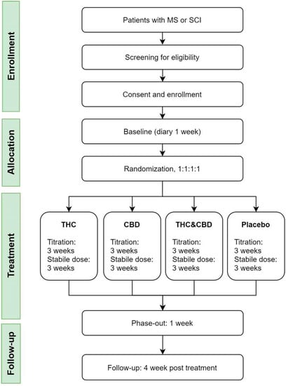 The main aim of the present study is to investigate the effects and side-effects of CBM in pwMS and pwSCI. The study has numerous strengths. First, it is an investigator-initiated trial. Second, we use a relatively large sample size to reduce potential bias. We decided to investigate two patient groups with similar symptoms. It is plausible that their nerve damage is comparable, even though MS and SCI have different etiologies. Despite such potential differences in etiology, treatment of symptoms following nerve damage could be consistent [62,63]. Hence, we seize the opportunity to combine two patient groups in this study. Third, we have thoroughly conceived the study design. We investigate the two most widespread cannabinoids (THC and CBD) alone and in combination in a formulation where we know the exact amount of the administered drugs. By using capsule formulation, we limit the risk of unblinding. Fourth, we warrant an adequate dose of CBM in a secure setting with the possibility of individual adjustment. To avoid the need for imputation for the primary outcome, we ask all patients to continue to fill in their diaries even if they drop out of the study. Fifth, we have a proper setting for the PD/PK sub-study, investigating the metabolism of cannabinoids in a patient population. Finally, we make an extensive examination of side-effects.