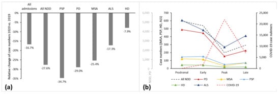 We conducted a cross-sectional study using the nationwide administrative claims database covering 1468 hospitals and 11,464,523 patient admissions between 16 January and 15 May 2020 (5,210,432) and 2019 (6,254,091), respectively. The high-quality and validated diagnosis-related group (DRG) database has been described in detail previously for this purpose [7]. No informed consent or ethical approval was required, as this analysis of anonymized secondary data was provided by the German Federal Statistical Office complying with the German data protection regulations. Data were retrieved retrospectively on 19 October 2020. The primary outcome was the year-to-year relative change in inpatient case numbers of NDD patients during a four-month period covering the first pandemic wave (16 January–15 May 2020). The analyzed NDD comprised PSP, MSA, PD, ALS, and Huntington’s disease (HD). Accordingly, inclusion criteria comprised the presence of the respective ICD/DRG codes, whereas any other ICD code served as an exclusion criterion, together with key “06” (discharge to another hospital), thereby avoiding multiple counting. Overall hospital admissions were used as a reference. According to the dynamic of COVID-19 cases [7], we divided the course of the first wave of the pandemic into four phases of a one-month duration each, including a prodromal, an early, a peak, and a late phase with corresponding inpatient numbers of COVID-19 (Figure 1b, Table 1). Secondary outcomes included year-to-year relative changes during the predefined four-week peak phase. Furthermore, we investigated pre/post relative changes between the different phases of the first wave to account for temporal trends. We used the main diagnosis codes according to the International Classification of Diseases 10th revision, German Modification (ICD-10-GM), as shown in Table 1. The statistical analysis was done in a descriptive approach.