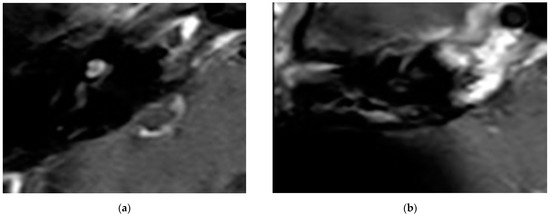 - Deux, J.F.; Marsot-Dupuch, K.; Ouayoun, M.; Huy, P.T.B.; Sterkers, J.M.; Meyer, B.; Tubiana, J.M. Slow-growing labyrinthine masses: Contribution of MRI to diagnosis, follow-up and treatment. Neuroradiology 1998, 40, 684–689. [Google Scholar] [CrossRef] [PubMed]