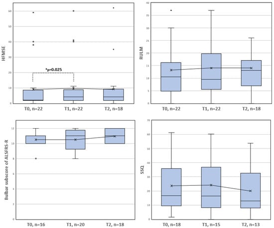 No significant change in bulbar function measured by the bulbar subscore of the ALS-FRS-R was found between T0 and T1 (z = −0.302, p = 0.763, n = 15) or between T0 and T2 (z = −1.406, p = 0.160, n = 13). The mean bulbar subscores from the ALSFRS-R were 10.50 (standard deviation (sd) = 1.21, n = 16) at T0, 10.50 (sd = 1.32, n = 20) at T1 and 10.94 (sd = 0.97, n = 18) at T2. Five patients showed improved scores, three showed worsened scores, and seven showed unchanged scores from T0 to T1. From T0 to T2, the bulbar subscore on the ALSFRS-R was improved in five patients, worsened in two patients and remained unchanged in six patients. No significant change was found in the SSQ score between T0 and T1 (z = −0.210, p = 0.834, n = 13) or between T0 and T2 (z = −0.392, p = 0.695, n = 12). The mean SSQ scores were 23.59 (sd = 18.85, n = 18) at T0, 24.12 (sd = 19.32, n = 15) at T1 and 19.95 (sd = 17.86, n = 13) at T2. Regarding the SSQ, from T0 to T1, improvements were reflected by lower scores in eight patients and decreases in five patients. From T0 to T2, six patients’ SSQ scores improved, and six patients’ scores worsened. The data distribution and results of the paired comparisons are shown in Figure 1. Measures of central tendency and dispersion of the bulbar scores and the HFMSE and RULM scores at T0, T1 and T2 are also listed in Table 2.