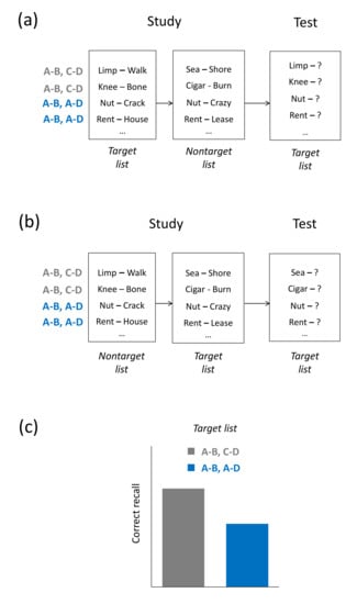 Paired-associate learning was first introduced in the late 19th century [26] and has since become one of the most applied learning tasks in memory research. In the retroactive-interference version of the task, participants initially study a first (target) list that may comprise stimulus-response word pairs (e.g., houserent, or A-B) and then a second (nontarget) list consisting of additional pairs. The list-2 pairs are either overlapping or non-overlapping. In overlapping pairs, the first-list stimulus word is repeated and a new response word is associated with the stimulus word (e.g., houselease, or A-D), whereas in non-overlapping pairs, both the stimulus and response words are new (e.g., earthround; tablecook, or A-B, C-D). Some studies include a third type of list-2 pairs, in which the list-1 pairs are simply repeated (A-B, A-B). On a later test, the stimulus word is shown and the first-list response word (the `B’ response) needs to be recalled, with results typically showing that recall of the first-list responses is impaired for the overlapping (A-B, A-D) pairs when compared to the non-overlapping (A-B, C-D) pairs or the repeated (A-B, A-B) pairs. The study phase of the proactive-interference version of the task is identical to the retroactive-interference version, but at the later test, participants are asked to retrieve the second-list response word (the `D’ response). Analogous to the retroactive-interference version, recall of the second-list responses is often found to be impaired for overlapping pairs relative non-overlapping or repeated pairs, thus reflecting buildup of proactive interference [9,10] (see Figure 1a–c). Interference effects in paired-associate learning have been found to occur across a variety of study materials, including syllable–noun pairs [27], noun–noun pairs [28], odor–picture pairs [29], picture–word pairs [30], or pairs of colors and color words [31].