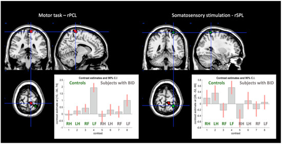 Regions activated during tactile stimulation of hands and feet are reported in Figure S1 and Table S1. In both controls and subjects with BID, the tactile stimulation of hands and feet activated the bilateral sensorimotor cortex with more medial activations for the stimulation of the feet and more lateral activations for the stimulation of the hands (Figure S2).