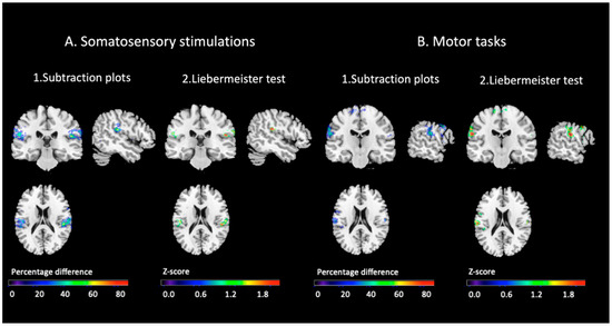 The within-group assessments of the activation patterns for the somatosensory stimulation and motor execution tasks were consistent with those previously found in the literature. This demonstrates the quality of the present fMRI data (e.g., see [54,55]).