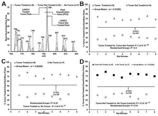 As previously described [,,], post-acquisition MS spectral data processing was performed by locally normalizing each injection data stream set to a total peak intensity value of 100 within a 10 m/z window along the 150–2000 m/z observed range. Peaks were identified using standard valley to valley definition and averaged to closest 1 unit m/z values. Triplicate data for each sample were also averaged to provide a representative spectral peak pattern for each sample. Leave One Out Cross Validation (LOOCV) analysis format was utilized to assess the similarity and significance of peak patterns between the known (treated tumor, tumor not treated, and no tumor) groups, using t-tests (significance designated at p < 0.05, one-tailed, unequal variance). LOOCV analysis is used to limit overfitting potential, which is the over-optimistic bias potentially observed when a sample is tested against a set of test variables constructed from a group of samples that also included the sample being tested. The use of the LOOCV procedure helps reduce this bias by serially removing one sample from the dataset and creating a set of test variables from the remaining samples. The variable sample set is then only valid for use against that particular left-out sample. The sample data is then replaced into its proper group, and the next sample is removed, and a new variable set is constructed for it. As graphically presented in Figure 1A, the peak area at each m/z is compared to the remaining samples. If the left-out sample peak is above the PCV, then that peak is scored with the pathology of the group with the higher mean at that peak; otherwise, the peak is scored with the pathology of the group with the lower mean. When all peaks are scored, the percentage of those peaks scored in each group can be reported on the y axis (see Figure 1B–D). Additionally, a database series is created where treatments groups are evenly mixed (referred to as random groups) to assess the potential for identifying random unrelated data patterns using the same methodology and number of significant peaks. Each sera sample is scored against its respective database by performing the above described LOOCV, analyzing each peak between the 400–2000 m/z range.