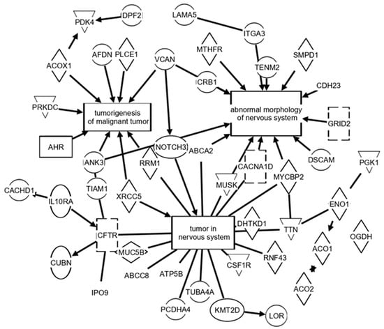 Tumorigenesis and nervous system pathways implicated by Ingenuity® Pathway Analysis (IPA®) of serum MS/MS results from untreated vs. treated rat brain tumor model. Values below each protein abbreviation represent the base-2 logarithm [untreated (# hits)/treated (# hits)] utilized by IPA software. Following this format, negative numbers indicate an increase in the number of hits observed in the drug-treated tumor samples compared to untreated tumor samples.