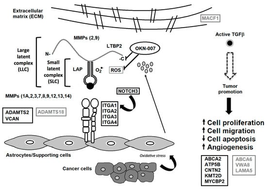 TGF-β associated with the tumor microenvironment. Some matrix metalloproteinases (MMPs) cleave LTBP, which releases latent TGF-β from the extracellular matrix (ECM). Various MMPs activate latent TGF-β through proteolytic cleavage of the latency-associated peptide (LAP), whereas integrins expressed on astrocytes (ITGA1, 2, 3 and 4) bind to the large latent complex (LLC), and activate latent TGF-β through MMP-dependent cleavage of LAP. Integrins (ITGA1, 2, 3 and 4) bind to the LLC and induce conformational changes in the latent complex through contractile action from activated astrocytes. Reactive oxygen species (ROS) produced by activated astrocytes from the induction of oxidative stress from nearby cancer cells may lead to the oxidation of the LAP domain and induce allosteric changes that release mature TGF-β from LAP. The mature (active) form of TGF-β can then bind to its receptor and then turn on tumor-promoting and tumor-suppressive properties. NOTCH3 activates ITGA1 [], which are both decreased by OKN-007. VCAN is highly expressed in high-grade gliomas [], which is decreased by OKN-007. ADAMTS2 is highly expressed in some cancers [], which is decreased by OKN-007. ADAMTS18 is a tumor suppressor [], which is elevated by OKN-007. During tumor promotion, activated TGF- β led to decreased apoptosis and increased cell proliferation, cell migration, and angiogenesis []. OKN-007 is thought to act via LTBP and downregulates several genes associated with the ECM [], and is also a free radical scavenger [], resulting in the reversal of the major tumorigenic characteristics, i.e., increases tumor cell apoptosis and decreases cell proliferation, migration and vascular angiogenesis []. Other proteins decreased by OKN-007 include ABCA2, ATP5B, CNTN2, KMT2D, and MYCBP2. Other proteins elevated by OKN-007 include ABCA6, VWA8, LAMA5, and MACF1. Serum proteins decreased by OKN-007 are highlighted in black rectangular boxes. Serum proteins elevated by OKN-007 are depicted in gray rectangular boxes. Previous down-regulated genes include ITGA1, and 4, ADAMTS2, MMP 3, and 12, as well as several collagen genes (COL1A1, COL3A1, COL4A1, COL5A1, COL6A2, and COL7A1) []. Modified from Towner et al. [] and Costanza et al. [].