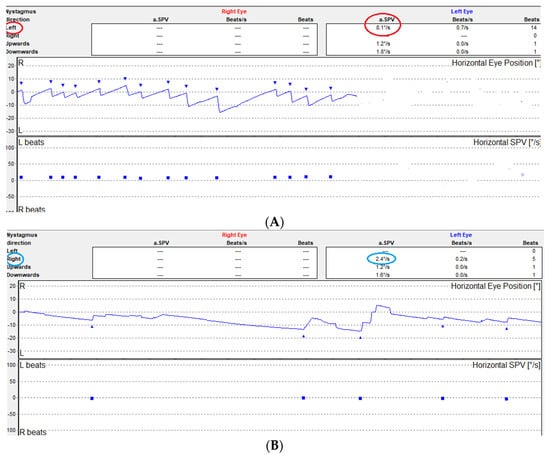 (A) Spontaneous nystagmus recorded with absence of fixation 48 h after the vestibular insult (first consultation). (B) Recovery spontaneous nystagmus recorded with absence of fixation seven days later (second consultation).