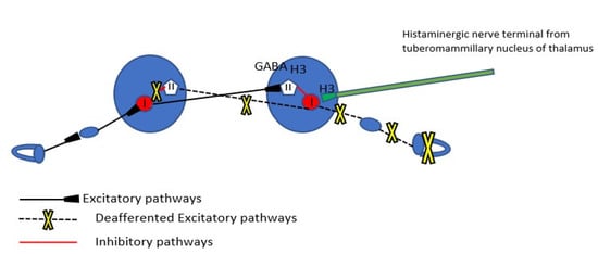 The commissural pathway modulations immediately after unilateral vestibular deafferentation. Type I neurons in the MVN of the ipsilesional side are silenced because of interruption of the peripheral vestibular input, but also by the inhibitory activity of Type II neurons of the same nucleus which are not only spared but potentiated by the exacerbated activity of contralateral Type I neurons which in turn are disinhibited by the disfacilitation of Type II inhibitory neurons of the healthy Medial Vestibular Nucleus (MVN). GABAergic receptors and H3 heteroreceptors (presynaptic) from commissural fibers to Type II neurons are also noted. The precynaptic H3 receptors on the histaminergic nerve terminals from the tuberomamilary nucleus of thalamus are noted (see below).