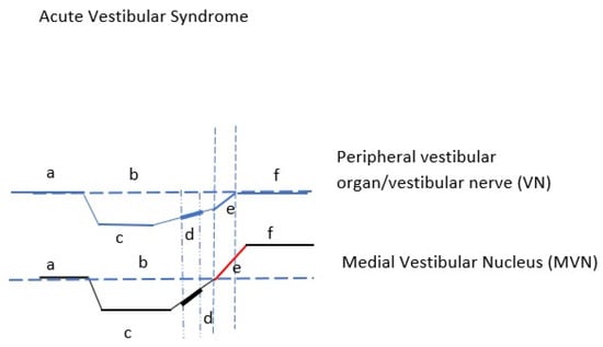 Schematic representation of vestibular nerve (VN) and medial vestibular nucleus (MVN) in acute vestibular syndrome. VN (a) peripheral organ normal function (b) activity line at rest, (c) peripheral organ deafferentation/hypofunction, (d) end organ begins to restore function, (e) final recovery of function, (f) peripheral organ function restored. MVN (a) nucleus baseline activity, (b) baseline activity line, (c) MVN discharge rate ceases, (d) beginning of resting discharge activity—beginning of central compensation, (e) the restoration of end organ function overstimulates the nucleus, (f) recovery nystagmus phase-nucleus hyperfunction. The thick sections in the restoration, (d) curves of VN and MVN represent the first consultation time point of the patient. Peripheral organ has regained much of its function, whereas the ipsilateral MVN begins to regain its intrinsic activity, not reaching yet the point of annulation of spontaneous nystagmus.