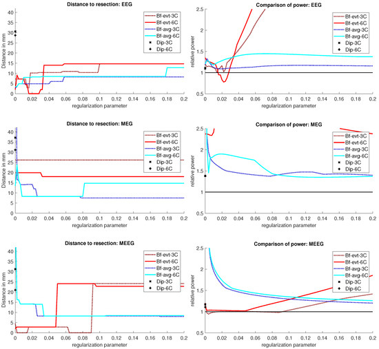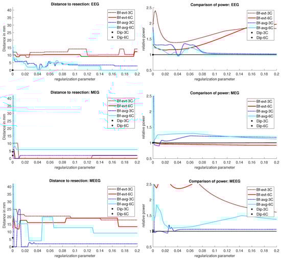 For the event-related beamformer, the 3C head model’s distance to the resection volume was 26 mm for the whole parameter range (bf-evt-3C in Figure 9, middle left subfigure). Its relative power was around 2.8 for all parameters, which is outside the shown range (middle right subfigure). The 6C head model (bf-evt-6C) showed an overall lower distance to the resection volume of 20 mm up to a regularization parameter of 0.034 and 18 mm above that value. Its relative power showed slightly more fluctuation, but gave high certainty to a localization outside the resection volume for all parameters. The average-based beamformer in the 6C head model (bf-avg-6C in Figure 9, middle left subfigure) had a distance to the resection volume of 8 mm (regularization parameters between 0.008 and 0.08) and 15 mm (above 0.08), while it was higher at lowest regularization. The 3C head model (bf-avg-3C) performed similarly, with 7 to 8 mm distance to the resection volume for a regularization above 0.026. Lower or no regularization led to very high distance values.