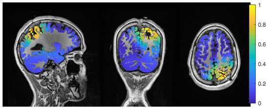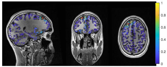 The event-related beamformer with the 6C head model localized into the resection volume with a high certainty for regularization parameters around 0.022. The localization with a parameter of 0.02 is shown in Figure 10. For higher values, both 6C and 3C head models localized 14 mm and 10 mm away, respectively, with strongly increasing certainty.