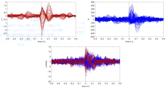 Butterfly plot of the averaged spikes of patient 1 in the EEG (red), MEG (blue), and MEEG (blue and red). The time point of the rising flank at −4 ms is marked with a vertical line from above and below. The horizontal line marks the zero activity line.