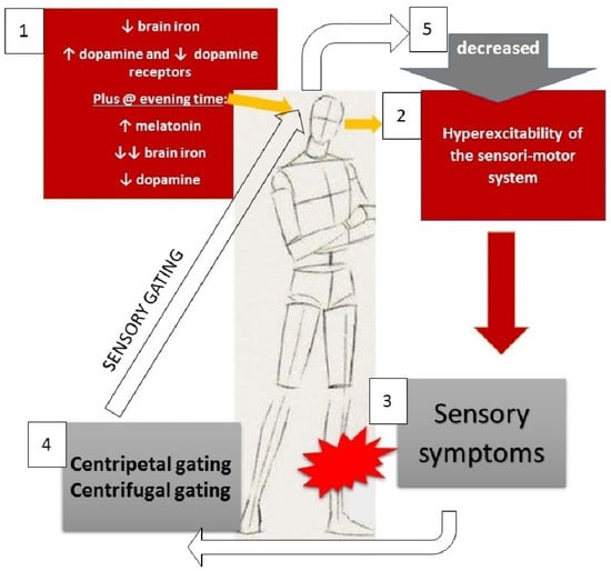 The involvement of neurotransmitters other than dopamine has also been reported. For instance, a hypoadenosinergic state, potentially linked to BID, may lead both to hyperglutamatergic and hyperdopaminergic states [44]. The latter might also be directly linked to BID [31]. Furthermore, endogenous opioids have been found to be decreased in sensory, but not in motor pathways, in RLS patients [45]. Therefore, the hyperdopaminergic state in RLS may lead to a decrease in endogenous opiates, which may contribute to the abnormal processing of sensory stimuli [46].