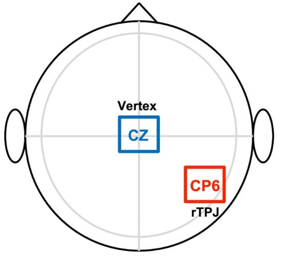 The active stimulation sessions consisted of 20 min of anodal tDCS over the right TPJ, with the cathode electrode placed at the vertex, that is, at the CP6 and Cz positions in the 10/20 international localization system, respectively (Figure 1). The electrode size was 25 cm2 and the current intensity was 2 mA, which involves a current density of 0.08 mA/cm2. The sham sessions had identical electrode setup and timing, except that real stimulation only took place during the first 30 s. Afterward, participants completed a survey regarding the tolerability of stimulation and guessing the stimulation condition. None of the participants reported special discomfort, and all believed they had been stimulated.
