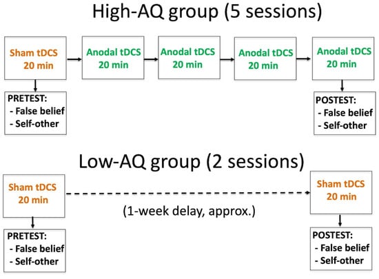 For this study, we selected two well-known tasks that are representative of cognitive ToM skills, that is, the false belief task and the self-other judgment task, which are associated with activations in the rTPJ. Both tasks involve a dissociation between representations of the self and representations of the other. The false belief paradigm consists of presenting stories in which a protagonist performs an action based on a false belief because he/she is unaware of a critical event, which the reader/listener knows. For example, “Mary puts her chocolate in the top drawer of the table, and while she was at the school, her mother moved it to the bottom drawer of the table. When Mary comes back home, will she look for the chocolate in the top drawer?” To correctly answer this question, participants need to recreate the outdated belief of the protagonist to understand her actions (looking in the top drawer) even though they know the chocolate is actually in the bottom drawer. These stories are contrasted with stories of “false photos” that also require the representation of outdated content but do not involve monitoring the characters’ beliefs. For example, “An old photo showed a house with a front door and two windows on the sides. In 2010 one of the windows was replaced with a new door. Did the old photo show the two doors?” Therefore, false belief stories and false photographs are similar in their general difficulty, logical complexity and inhibitory demands, but differ in the need to think about someone’s thoughts (false beliefs) [,,]. We expect that the anodal tDCS on rTPJ can improve the performance of the high-AQ participants in the false belief task, but not in the false photo task.