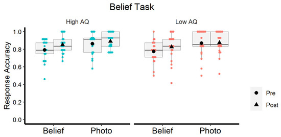 Concerning response accuracy, both groups showed similar high performance (high-AQ: M = 0.849; low-AQ: M = 0.837; F < 1). There was a slight improvement from the pre-test (M = 0.82, SD = 0.17) to the post-test (M = 0.86, SD = 0.16), which was statistically significant (F (1, 40) = 4.947; p = 0.032; η² = 0.110), suggesting certain familiarization with the task that was independent of the stimulation protocol. However, the crucial Test × Group interaction was not significant (F < 1), which means that the learning effect was similar in both high-AQ and low-AQ participants (Figure 3). Furthermore, both groups were more accurate in the photo (M = 0.87, SD = 0.15) than in the belief modality (M = 0.81, SD = 0.18); F (1, 40) = 17.236; p = 0.0001; η² = 0.301, which is consistent with other results in the literature []. The accuracy results are illustrated in Figure 3.